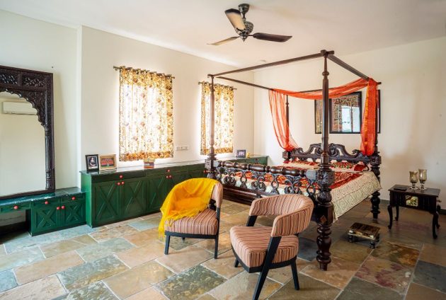 Further on, a small prayer & meditation room can be seen in a niche under the staircase. It is cordoned off from the main passage with a metal door encasing stained glass, adding a colorful aura in the enclosed sanctum. The private chambers on the upper floor are awe-inspiring spaces, exuding both grace & extravagance. Upon entering the master bedroom, one views themselves in a Regal- Rani mirror. The eyes further move towards the Maharaja four-poster bed, which frames and draws focus to three intricate Madhubani art pieces on the wall. Sure of stone, a hardy limestone was laid out as flooring in its raw buffed form, leaving the natural veins & embedded fossils to stand out. The children’s rooms continue to explore the Vernacular Palette, with floorings in bright colors of IPS, executed by skilled craftsmen. An element of interest is reflected in the skirtings which are machine cut 2D ceramic glazed tiles running in contrast to the colors of the floor. The rooms are adorned with handicraft leather lamps & Madhubani paintings. The lounge, essentially meant for relaxation, is finished in limestone flooring as well, adding to the comfortable vibe. All washrooms are appropriately sized with complementing fitting, and are uniformly clad in matt- finish- neutral color tiles, ornate mirrors & glimmering lights.