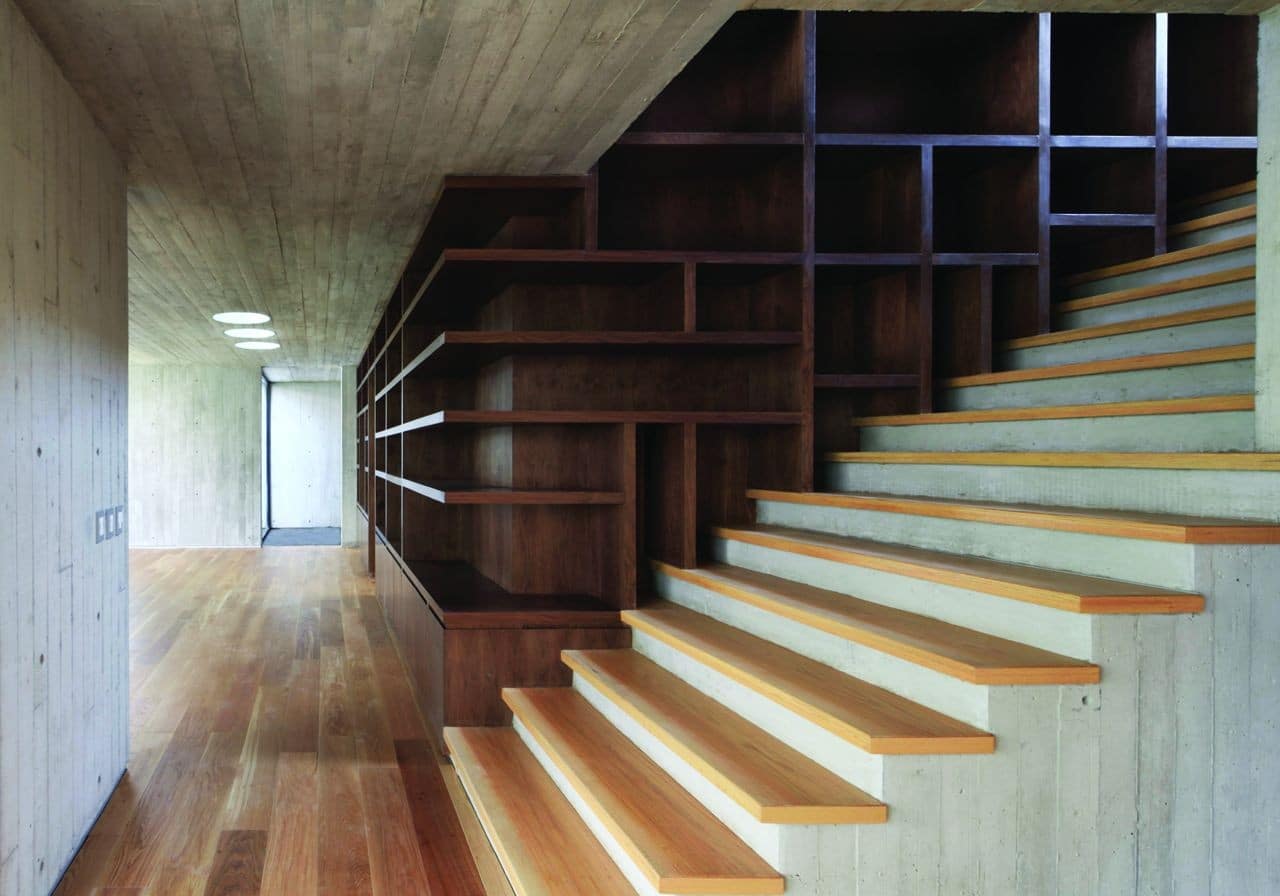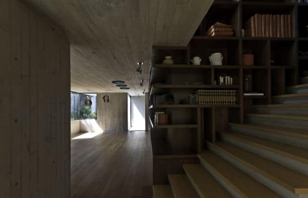 The piece that connects all the different spaces is a large wooden bookshelf which holds the central staircase and goes all the way from the basement to the top floor. The stairs, with the bookshelf on one of its sides, generate a wall-furniture which starts at the access door and goes through the living room until it bends and elevates to the next level turning into a first floor living room furniture and then on a bookshelf at the top of the house. This three-story tall bookshelf unfolds into the basement as a wine cellar, generating a wooden body which on every level has varying openings depending on the usage or program of each space.