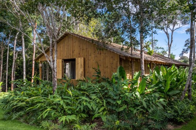 Eucalyptus pillars support beams and rafters; autoclaved pine slats form floors and ceilings; double-wall lateral panels of autoclaved pine 20 cm wide house plumbing and electrical runs while offering thermal and acoustic insulation. The roof, composed also of autoclaved pine boards, extends wide over eaves to shield from tropical sun and rain. The elevated floor brandishes the terrain with permeability underneath—preserving site drainage and vegetation rather than masking them.