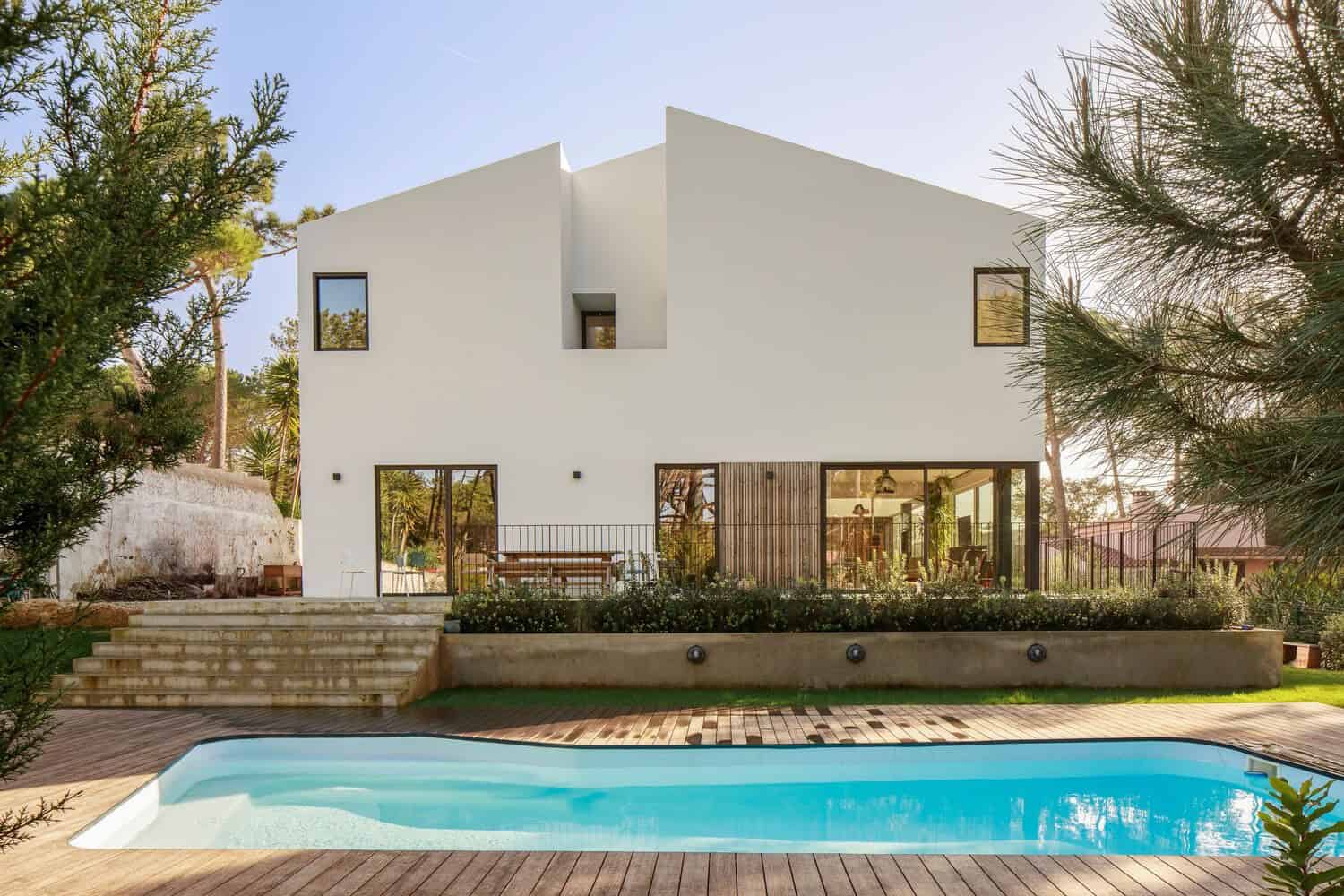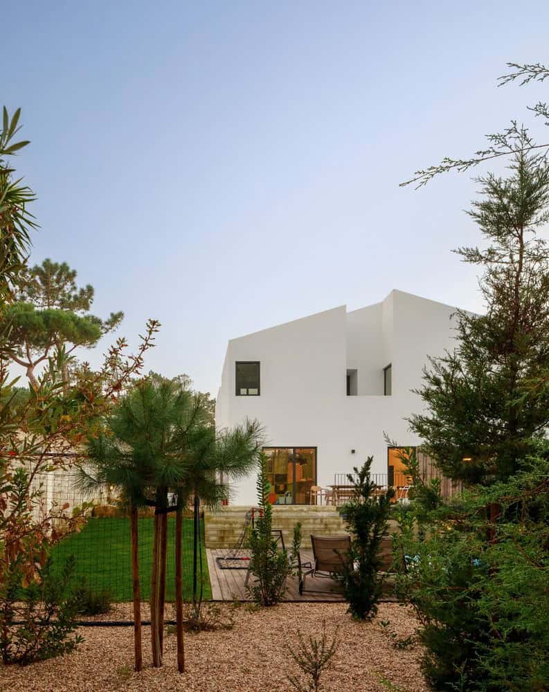 MH House by Esquissos – Arquitectura e Consultoria in Sintra, Portugal, is a contemporary residence that embraces its natural surroundings. Defined by white gabled volumes, generous balconies, and fluid indoor–outdoor connections, the project reinterprets traditional forms while offering modern comfort. With a design deeply rooted in its context, MH House demonstrates how architecture can achieve both elegance and harmony with nature.