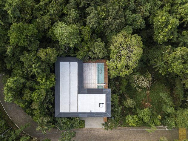 MH House emerges from a challenging, steeply sloping terrain deeply embedded in the Atlantic Forest, along Brazil’s São Paulo coastline. The design ambition was clear: craft a home that blends seamlessly with its environment, preserve privacy from the street, and open outward toward forest and sea.