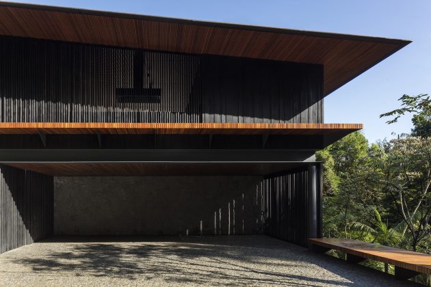 Carbonized wood cladding (charred façade) wraps the exterior, giving it a discreet, dark-toned presence that ages gracefully.