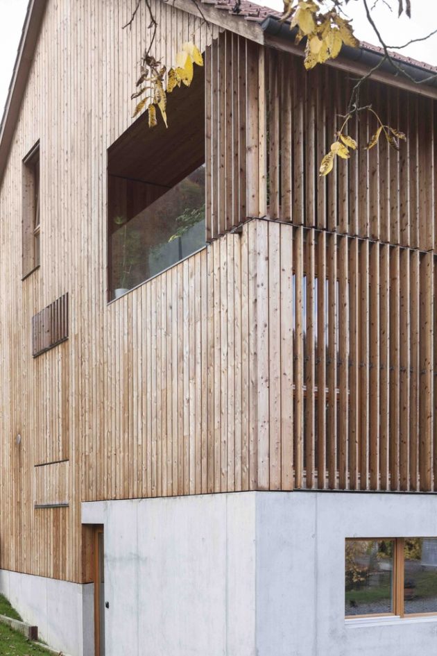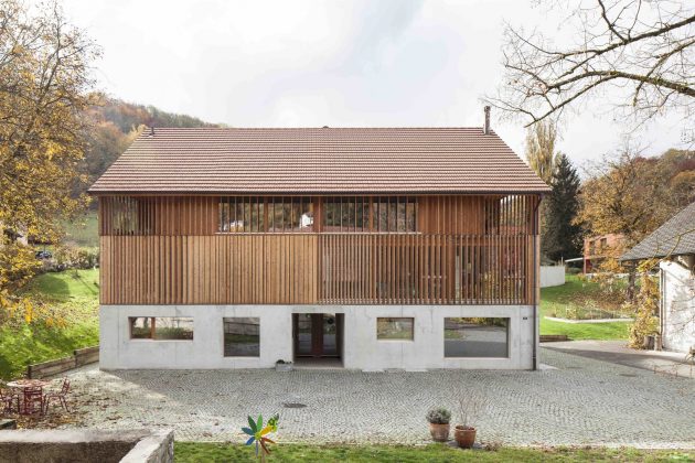 Beck + Oser Architekten have undertaken a conversion project in the Swiss countryside. The Mill Barn Conversion is an amazing project, converting a 6,000 square foot mill barn into a modern living space. It is located in Hofstetten-Fluh, Switzerland, surrounded by a peaceful countryside and beautiful landscapes. The home is clad in wood in order to blend in with the natural environment while inside of it, the interior is relaxed and casual, designed with minimalism in mind.