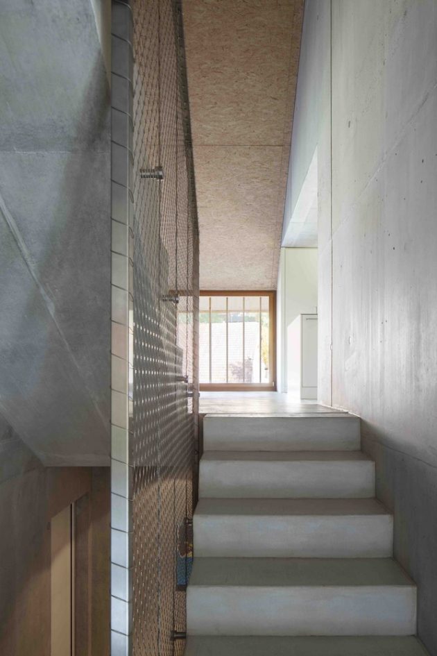 The four duplex apartments are all directly accessible from the mill court. The innovative apartment disposition with controlled spatial overlaps and nestings allows all residents to use the spacious and spatially exciting attic (vertical orientation) and on the ground and upper floor two apartment widths (horizontal orientation). The result is a surprising combination of the advantages of duplex and storey apartments. The half-storey concept allows a precise building placement in the slope and creates exciting spatial sequences. Two apartments are equipped with garden seating, two apartments are enjoying the private outdoor space in form of loggias.