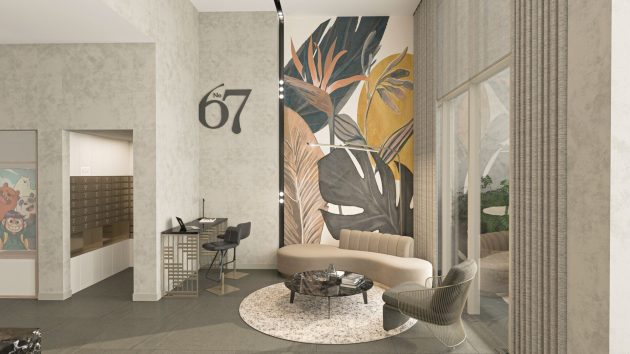 The residents’ gym is located on the first basement floor has a sliding glass façade opening onto the expansive sports terrace. The landscape was designed using this slope of the surrounding area to create an expansive terrace area where the café and the sport are open. Residents can use this terrace for open area sports activities like yoga or Pilates. The building also includes a spa and a cinema room within its context. The colour palette is a combination of browns, greys, and whites, respectively.