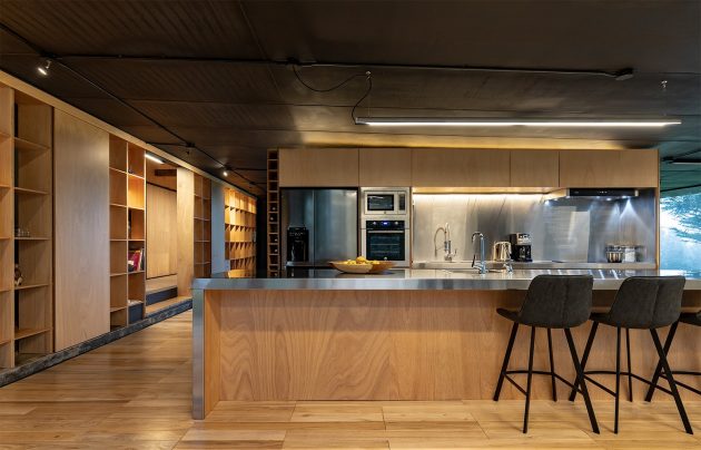 The house has an underfloor heating system in the social area and kitchen to maintain comfortable temperatures in the space without sacrificing the transparency of the facades.