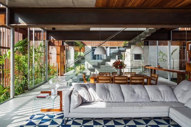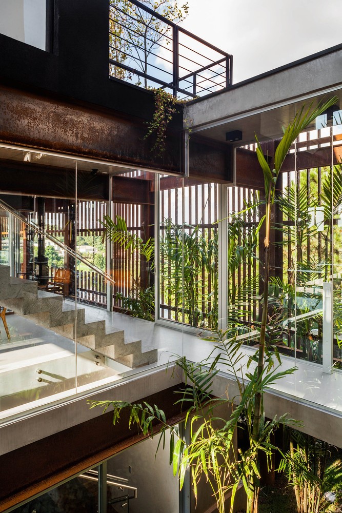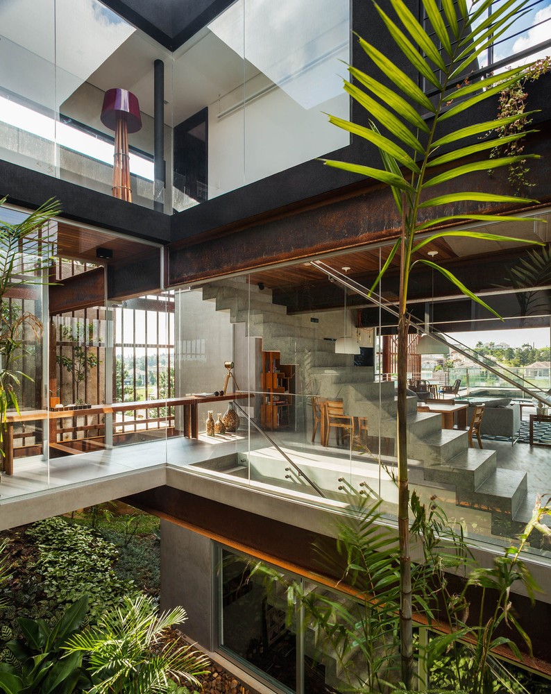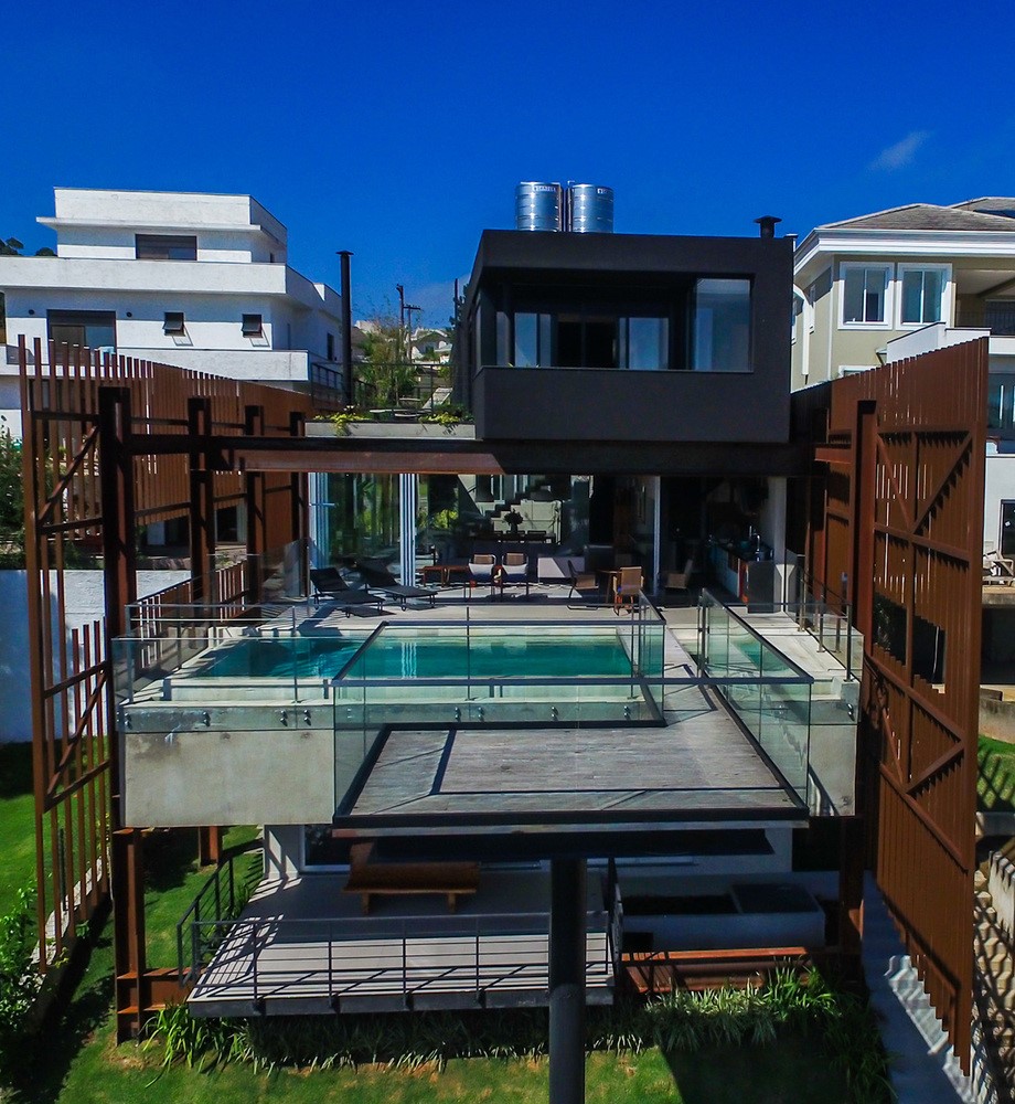 With these assumptions, we designed a simple metallic structure that overcomes variable spans of approximately 11 meters. This structure would be the space’s organizing core and would be allocated exactly on the permitted site limit, in addition to being a remarkable item of the building aesthetics. The residence would arise indeed through the trimmed slabs, supported by this primary structure. And most of the fences would be in tempered glass, resting in the slabs borders, maximizing the structure’s importance.