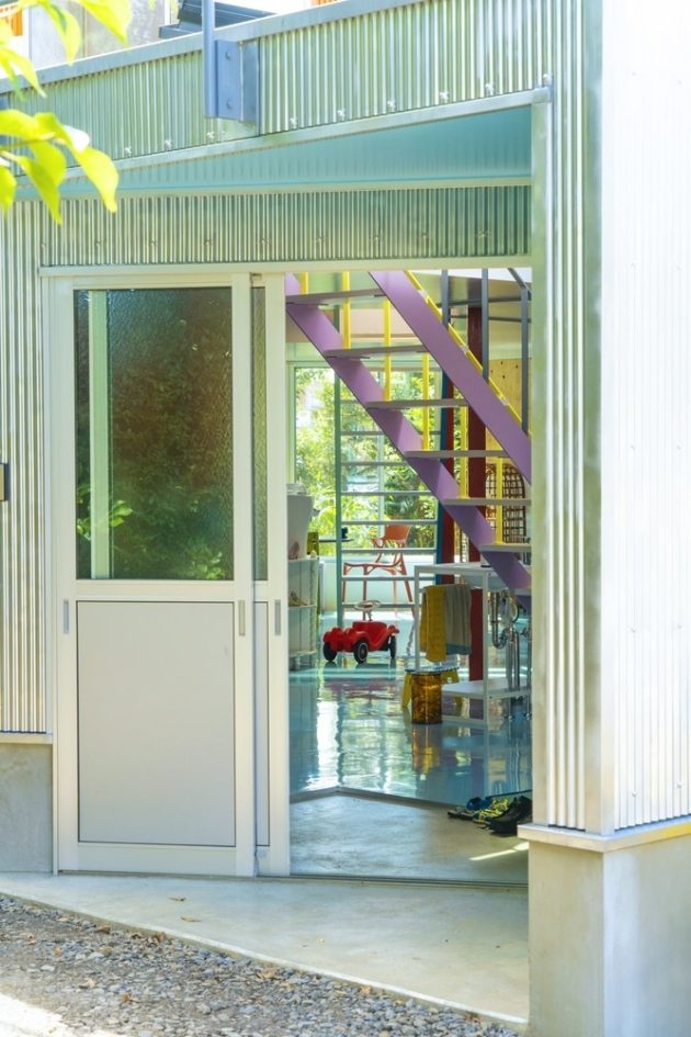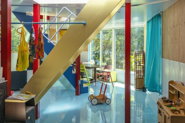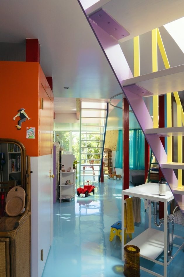 Miyazaki House, designed by Suzuko Yamada Architects in Japan, is a unique dwelling nestled on a triangular site at the edge of a lush park. The one-story building seamlessly integrates with the park, as the rooftop transforms into a garden that extends the greenery. Inside, the spacious studio features an unconventional arrangement where furniture, household items, and architectural elements coexist independently, creating a sense of individuality and harmony. The pillars and staircases, each with their own color and shape, serve as landmarks and facilitate the residents’ daily lives. As the family interacts with these scattered elements, a vibrant tapestry of colors and shapes emerges, creating a truly distinctive and personalized home.