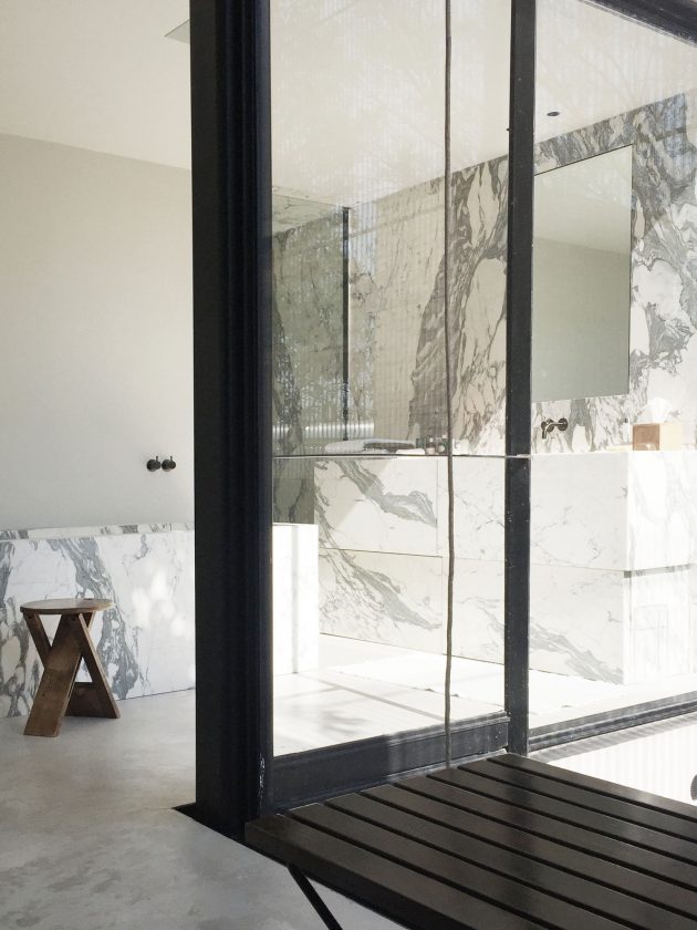 This project was about creating a secluded, serene urban retreat using a soft, luxurious, yet restrained material palette. The polished concrete floors run throughout the house, as the cemented walls and ceilings, creating a very strong identity and quiet thread. Locally sourced Parotta wood was used for the integrated millwork and a heavily textured Arabescatto marble for the kitchen and bathrooms. The atmosphere of the house is uniquely tranquil, comfortable and surprisingly elegant. Project icw Marc Merckx.