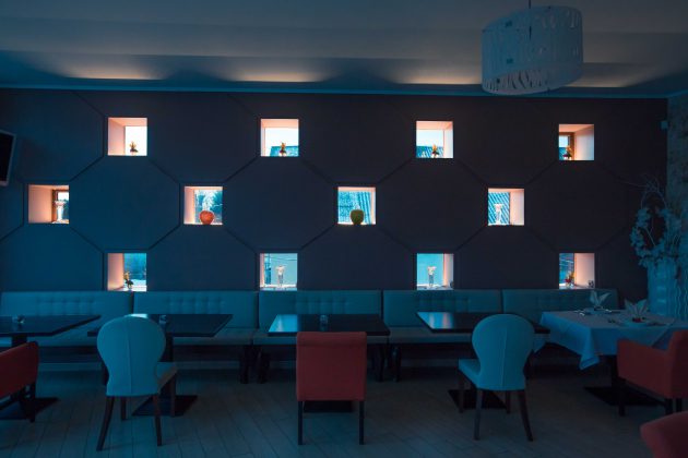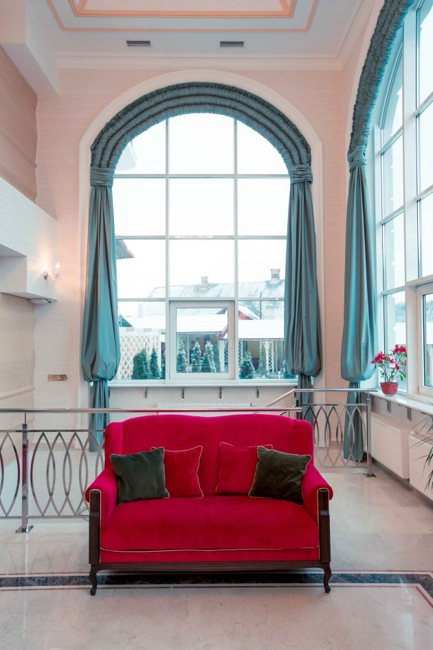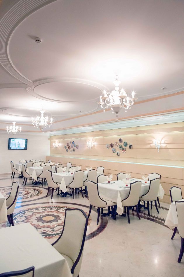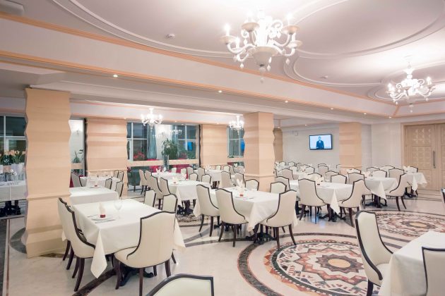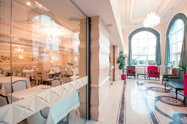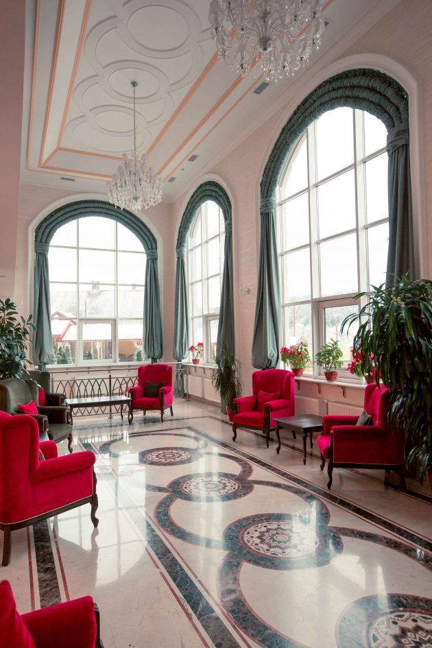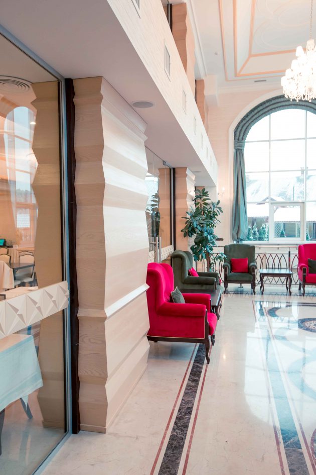 “Warm” colors make the hotel a cozy and friendly. Wherever you are, in a restaurant or at the reception desk, or even in the hallway, everywhere is lovely and nice lighting. Large windows let daylight in the form of arches and glass dome. Suspended chandelier with lots of transparent decorative elements simply mesmerizing. In the restaurant involved wooden elements that are stylized folk architecture. The floor is covered with a circular pattern of embroidery. Tables and chairs are made in light pastel colors, but do not merge visually , because on the edges of chairs used ebony. It looks quite stylish. As a result, a combination of modern interior elements of stylized folk motifs, so the design of the hotel will enjoy a modern lovers and lovers of the classics.