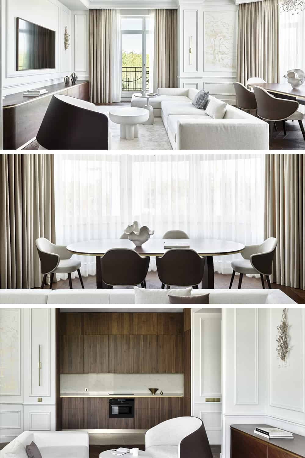 The main living space is anchored by soft, warm white walls and dark walnut accents, establishing a palette of harmony and contrast. Natural materials — wood, marble, textured fabrics — add depth and tactility, while slender lighting fixtures and minimal ornamentation enhance the modern neoclassical atmosphere.