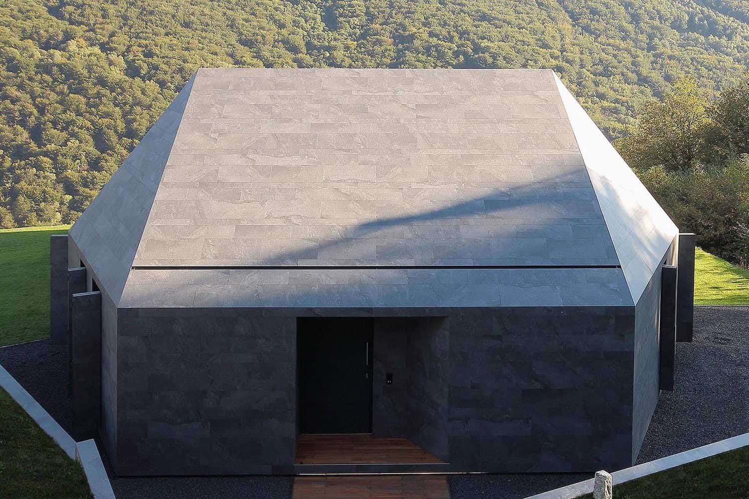 “The same porcelain stoneware material has been applied to the custom designed folding shutters, to match and align with the façade pattern when they are closed. The six-sided roof is offset toward the mountain and it’s calibrated to have the largest side with the same mountain inclination, for a better integration with the landscape.