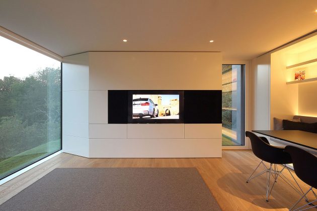 The Milan based architecture studio JM Architecture have designed the Montebar Villa in the middle of the Swiss Alps. The house is placed right at the edge of a slope which results in some truly spectacular views of the vineyards that are located underneath but also of the stunning natural greenery that surrounds the building on all sides.