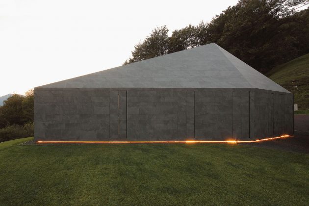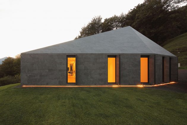 The project was created around the local building code, which imposes each house to have a dark gray pitched roof for a better integration with the environment. Starting from this constraint, the idea developed into an homogeneous solution using the same material for both the roof and façades, in order to provide the building with a monolithic aspect, like a stone in the landscape.