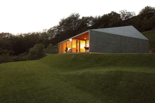 The architects created a sense of monolithic appearance because they had to follow local building code that the house had to fit. One of the most important features dictated by that code resulted in the dark grey pitched roof which helps with the integration of the building.