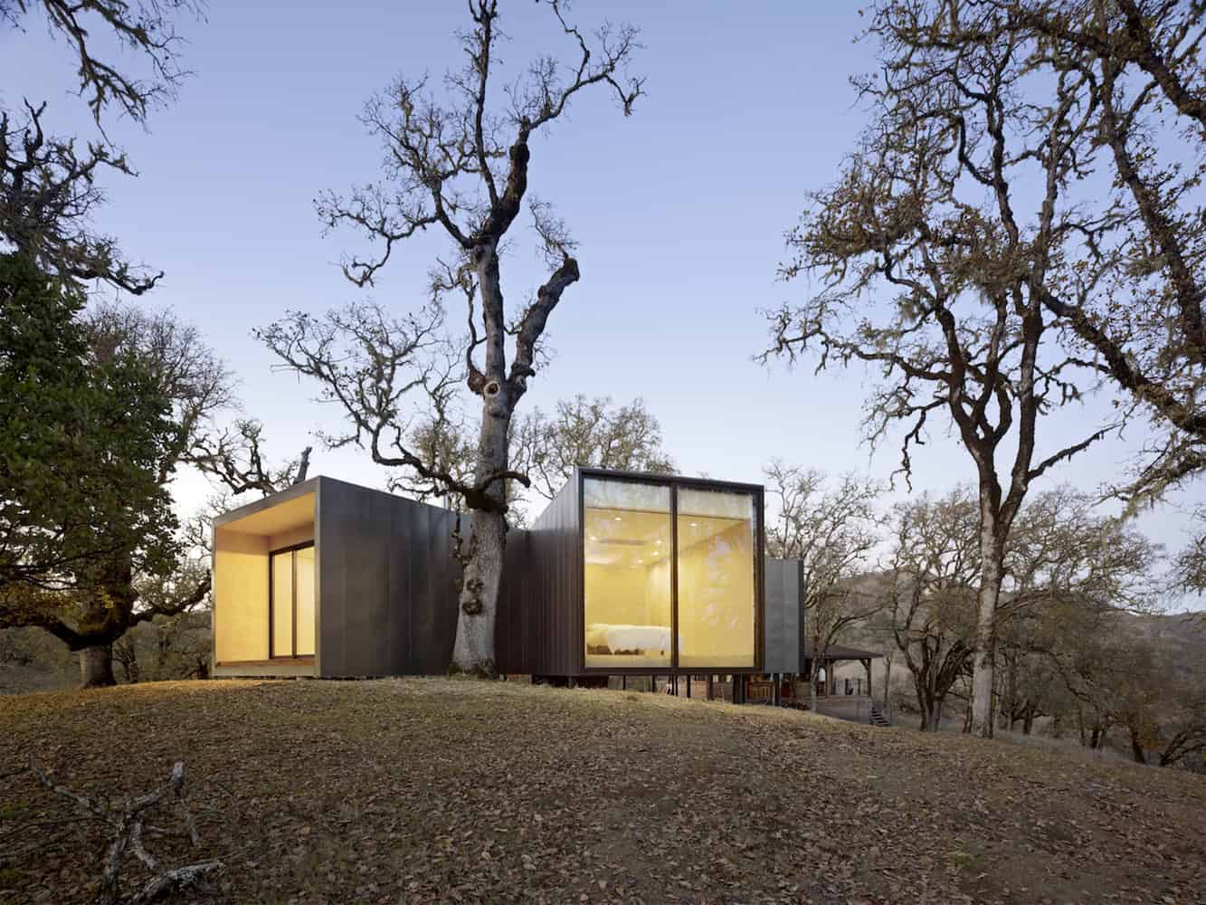 Suspended lightly above the ground on steel stilts, the house overlooks a dramatic panorama of vineyards, oak groves, and mountain ridges—a landscape that becomes both its inspiration and its canvas.