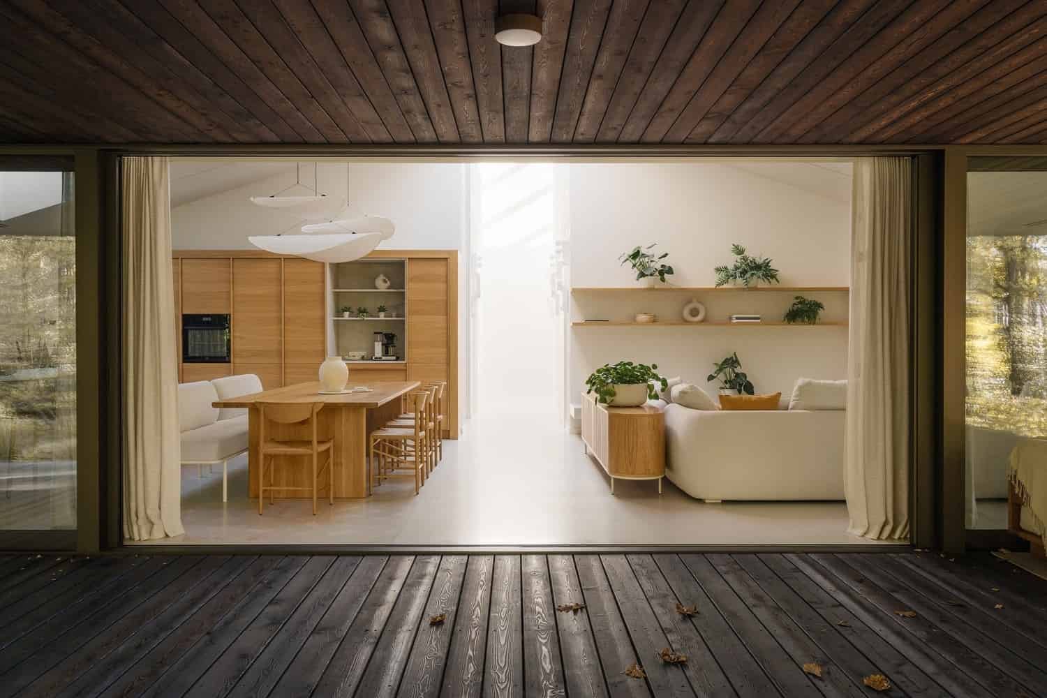 From the sheltered privacy of the bedroom wing to the outward-facing social wing, the house balances quiet retreat and open engagement—a composed companion to the woodland rather than a focal point within it.