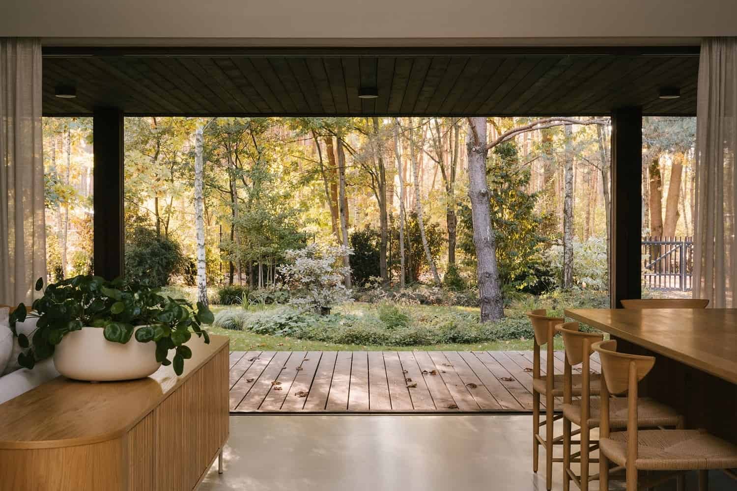 Windows are placed to frame trunks and clearings rather than views in the abstract—the forest is treated as a series of intimate vignettes, shifting with weather and season.