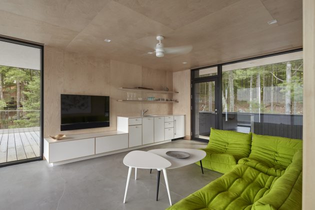 Inside, a combination of Baltic Birch and Douglas Fir plywood warms the spaces, wrapping the walls and ceilings in subtle tonal variations.