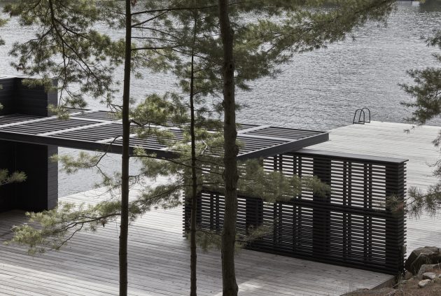 A cantilevered trellis, supported by a finely detailed wood screen, provides shade across the dock’s southwestern exposure.