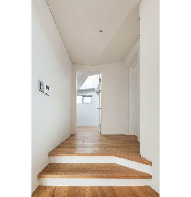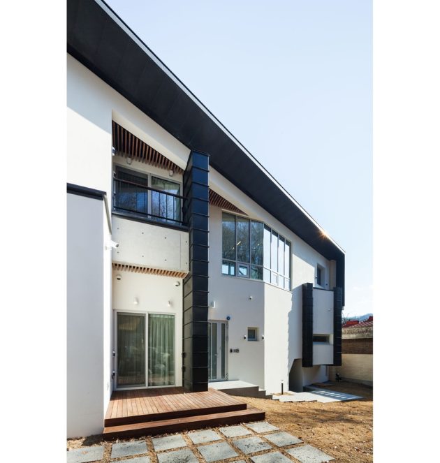 The architectural language, composed of straight lines, sharp angles and points of inflection, comes from the edge of the site, applied uniformly to this project interior and exterior as well. Various angles, above all, represent the spatial order and the metaphor of dynamism of life through interior elements. A waffle shaped ceiling element contains light and ventilation system in the living room is the specially designed sculptural element which makes space deeper visually through mirror effect.