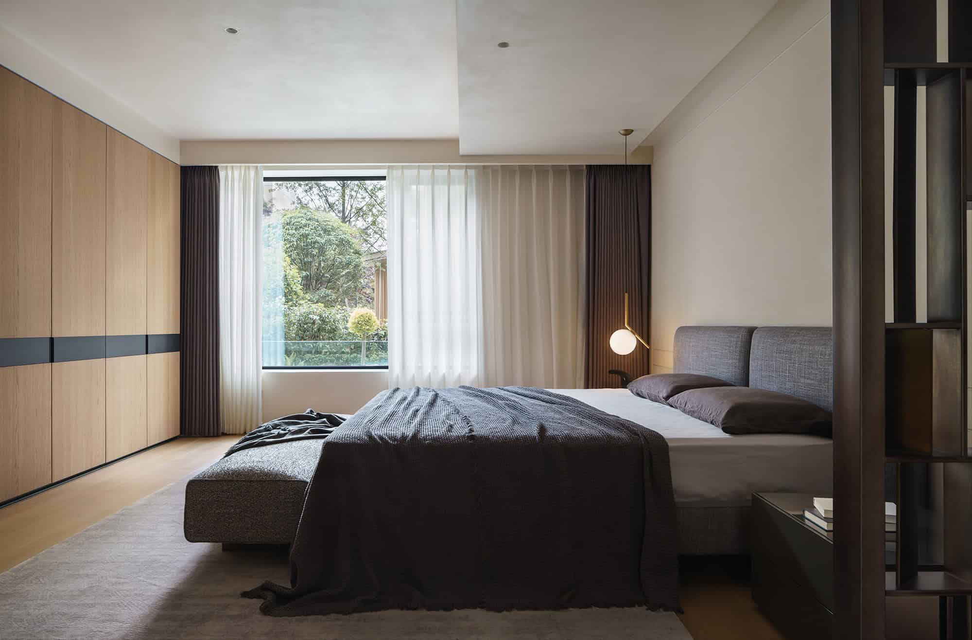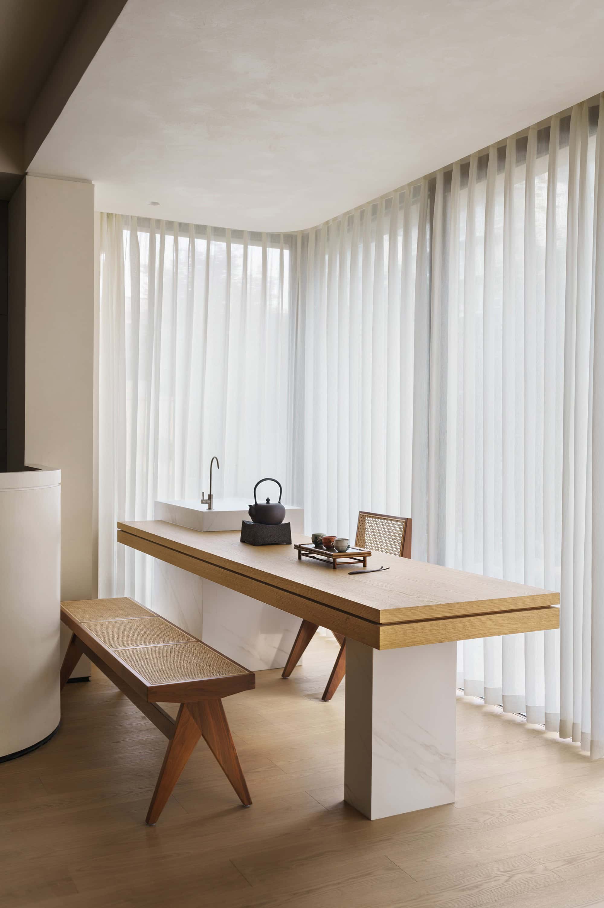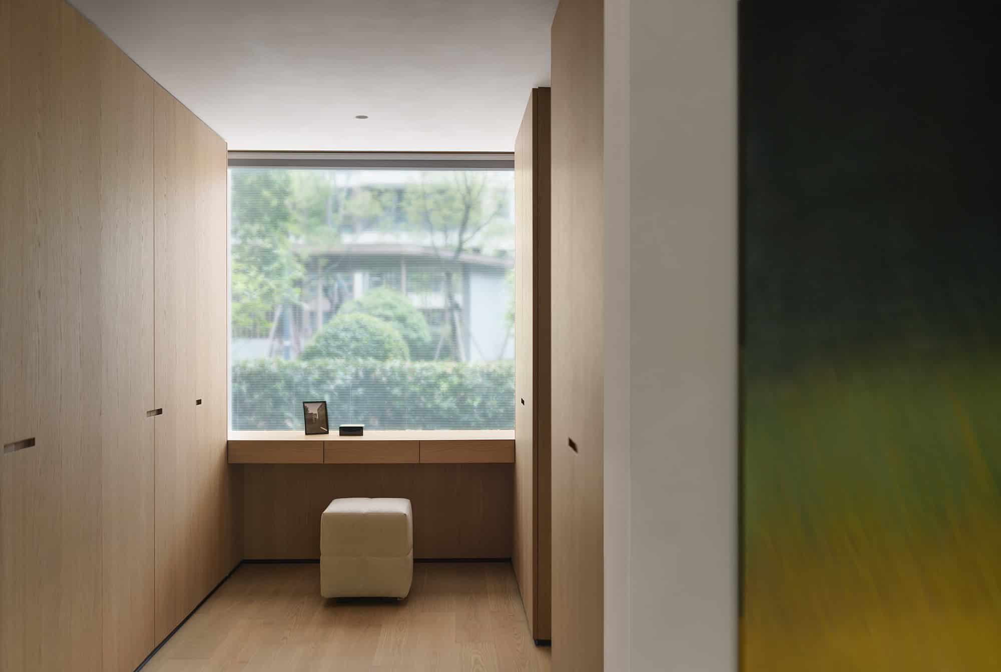 On the uppermost level, the master suite and tea room embody the essence of Eastern calm. The master bedroom’s fluid detailing and neutral tones reflect understated luxury, while the tea room, positioned beside wide windows, opens to the garden beyond — a contemplative retreat where architecture and landscape dissolve into one.