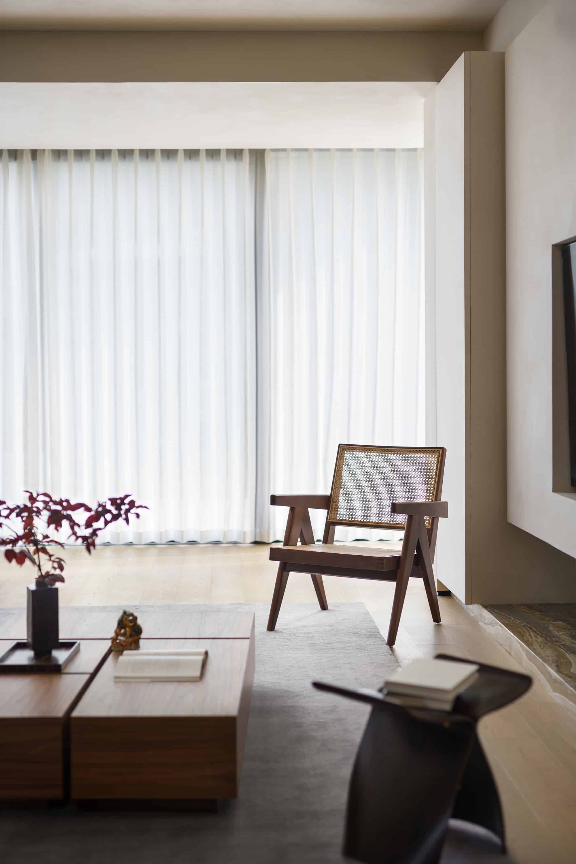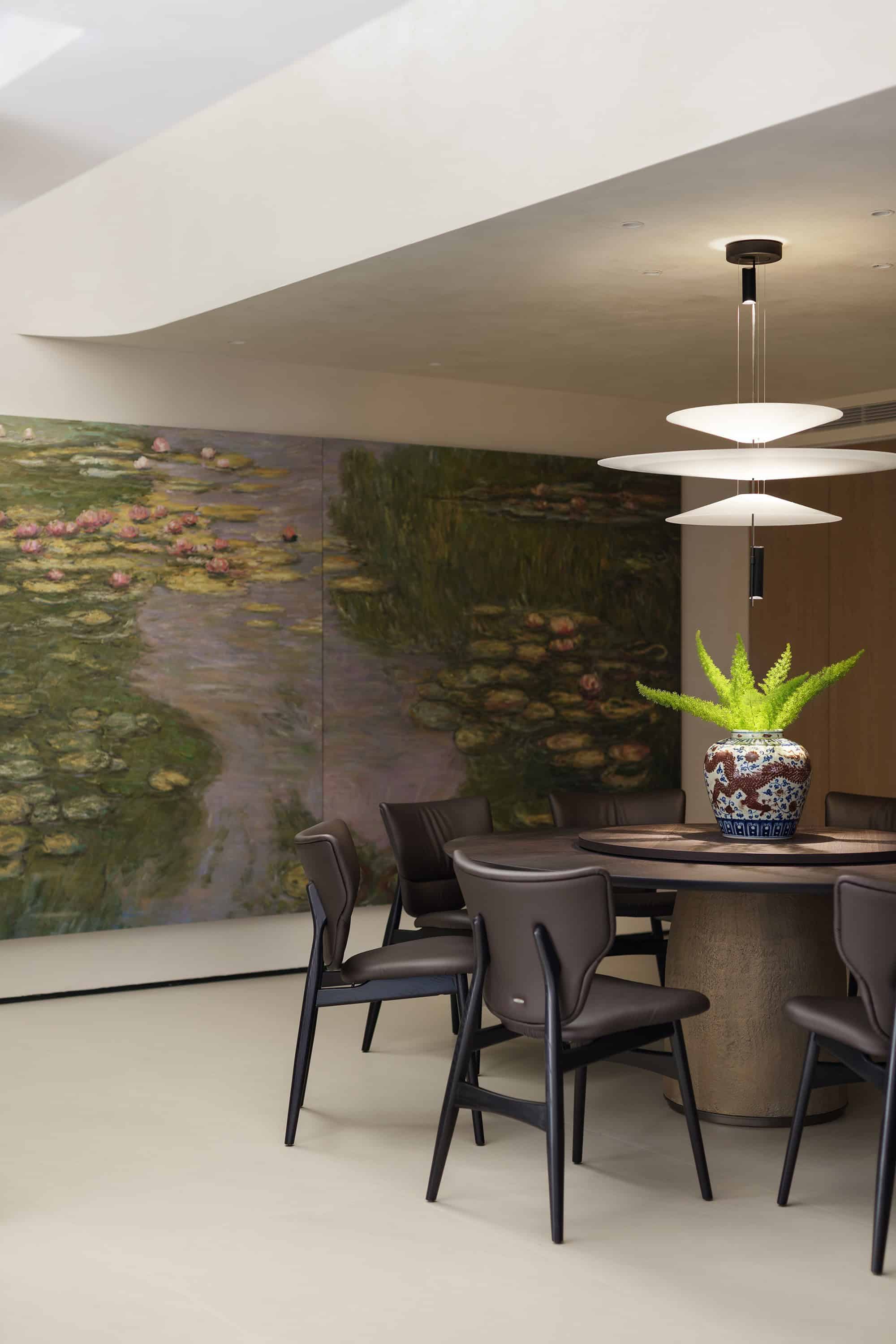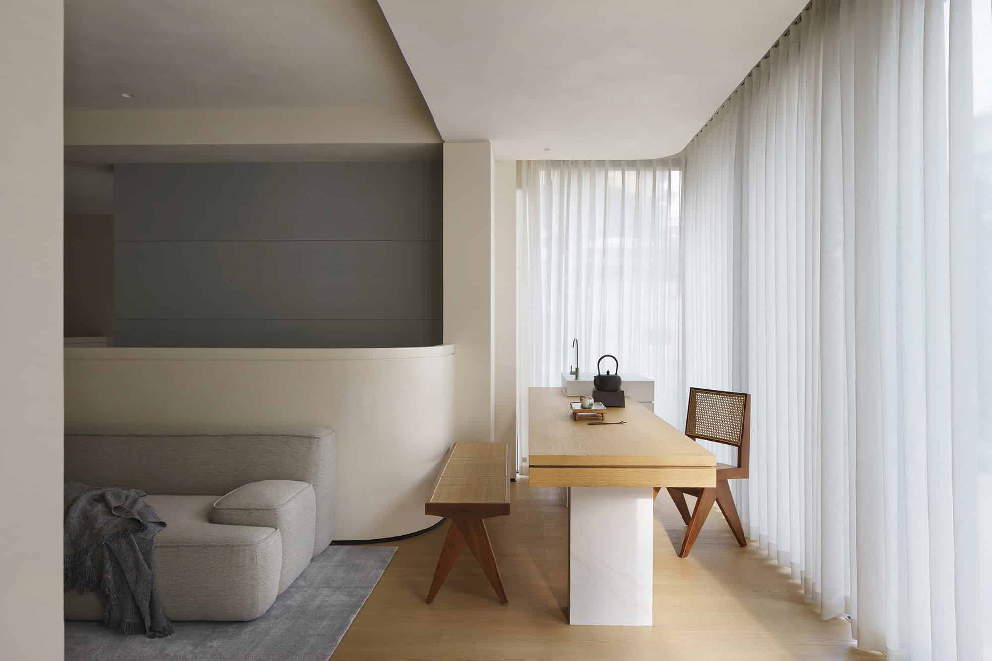 On the uppermost level, the master suite and tea room embody the essence of Eastern calm. The master bedroom’s fluid detailing and neutral tones reflect understated luxury, while the tea room, positioned beside wide windows, opens to the garden beyond — a contemplative retreat where architecture and landscape dissolve into one.