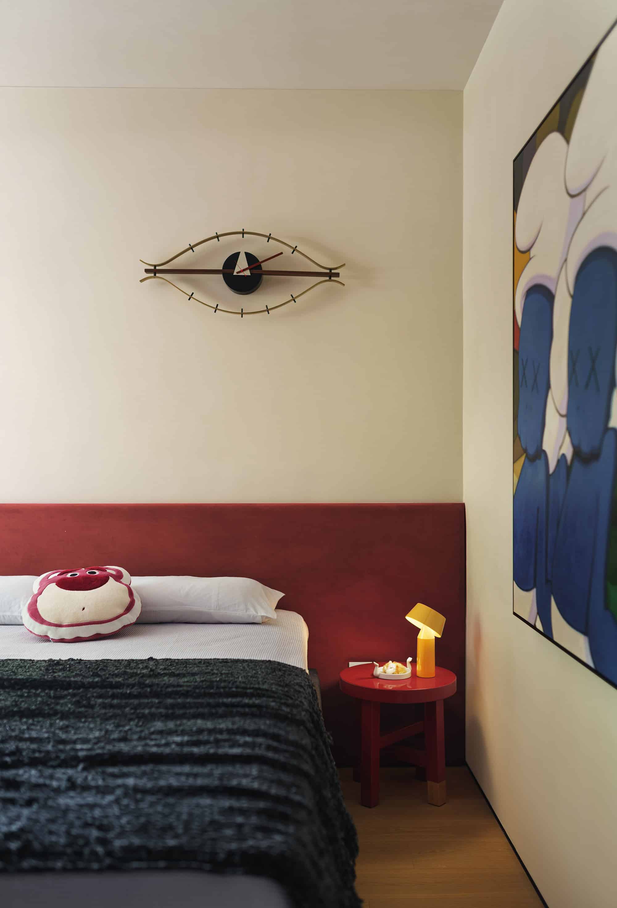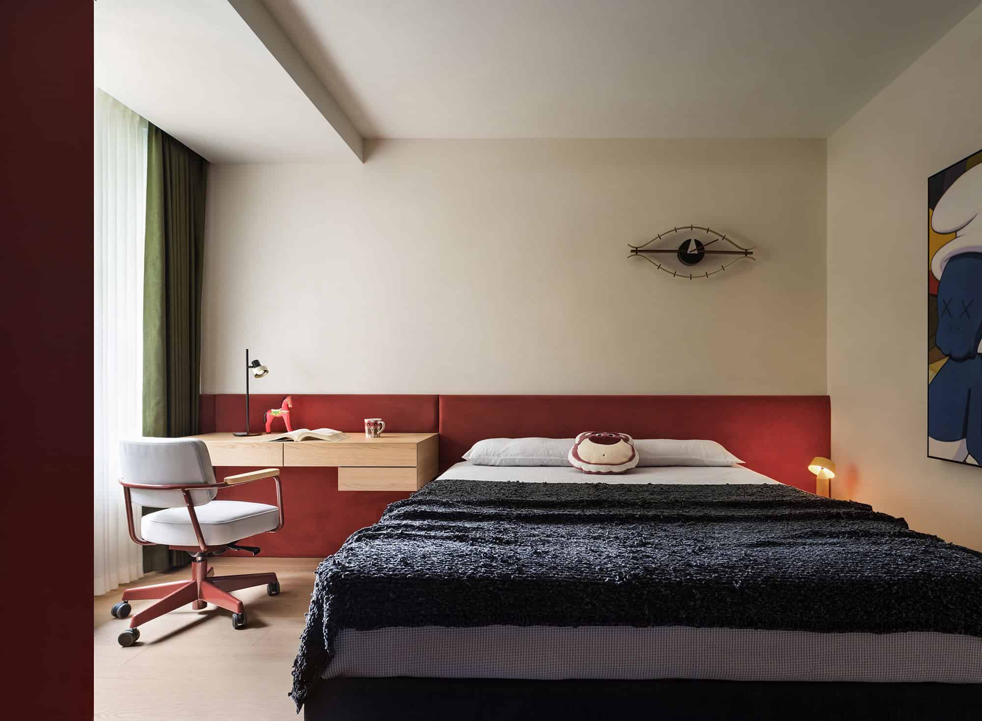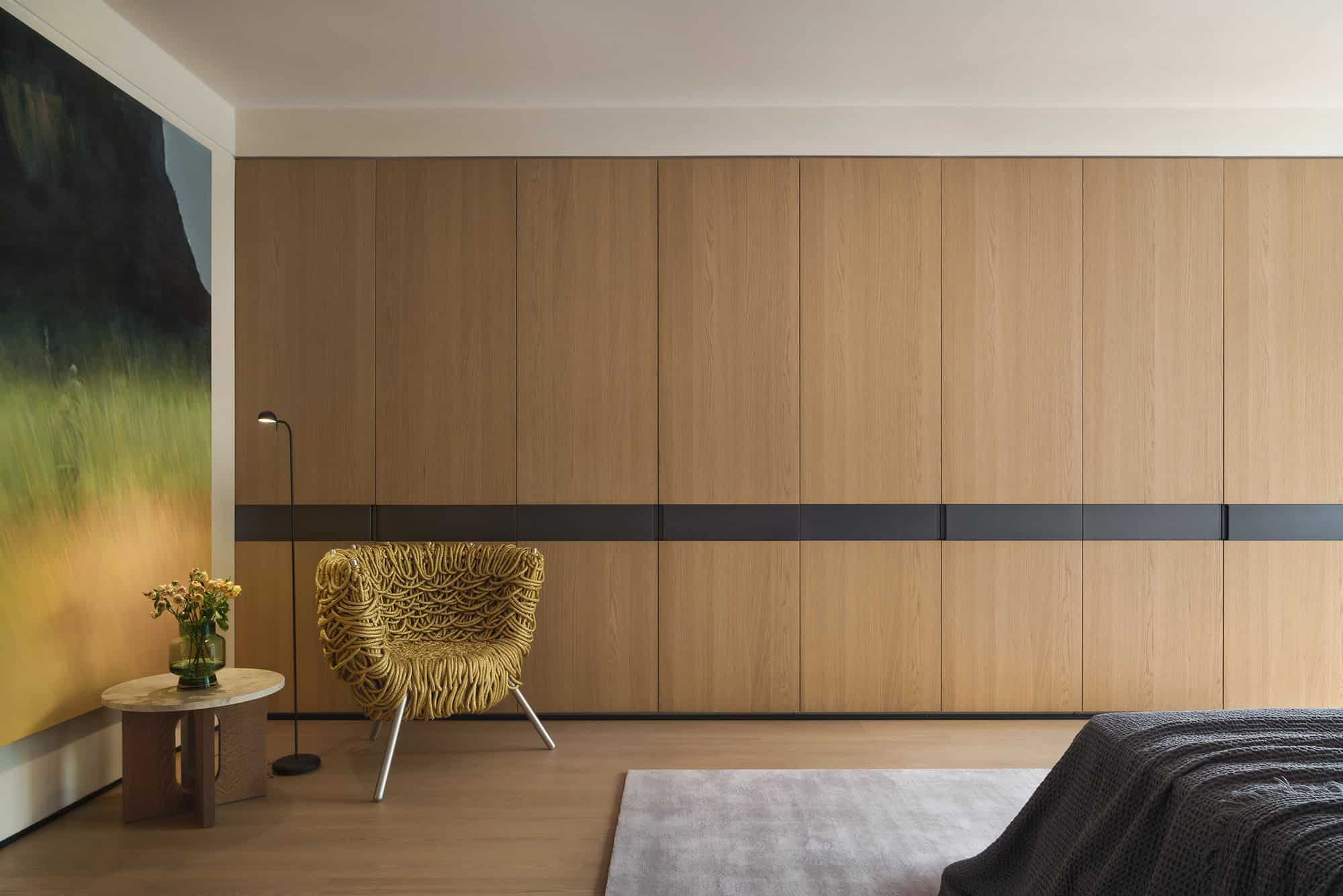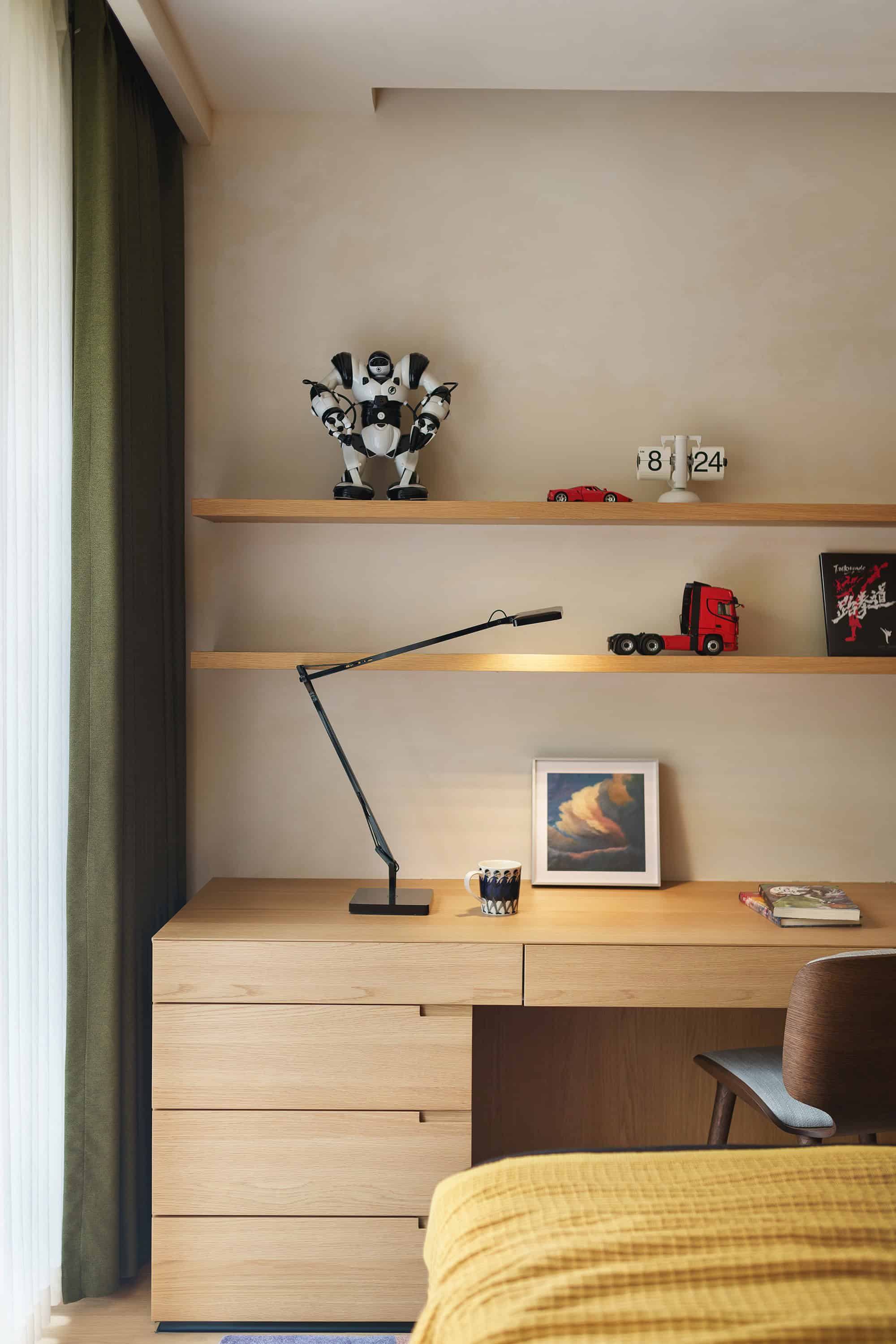 The children’s room introduces a softer narrative. Warm wooden tones paired with lemon-yellow accents evoke vitality and innocence, creating a space that nurtures imagination and joy. The simplicity of form — defined by minimalist geometry and authentic materials — fosters creativity and comfort alike.