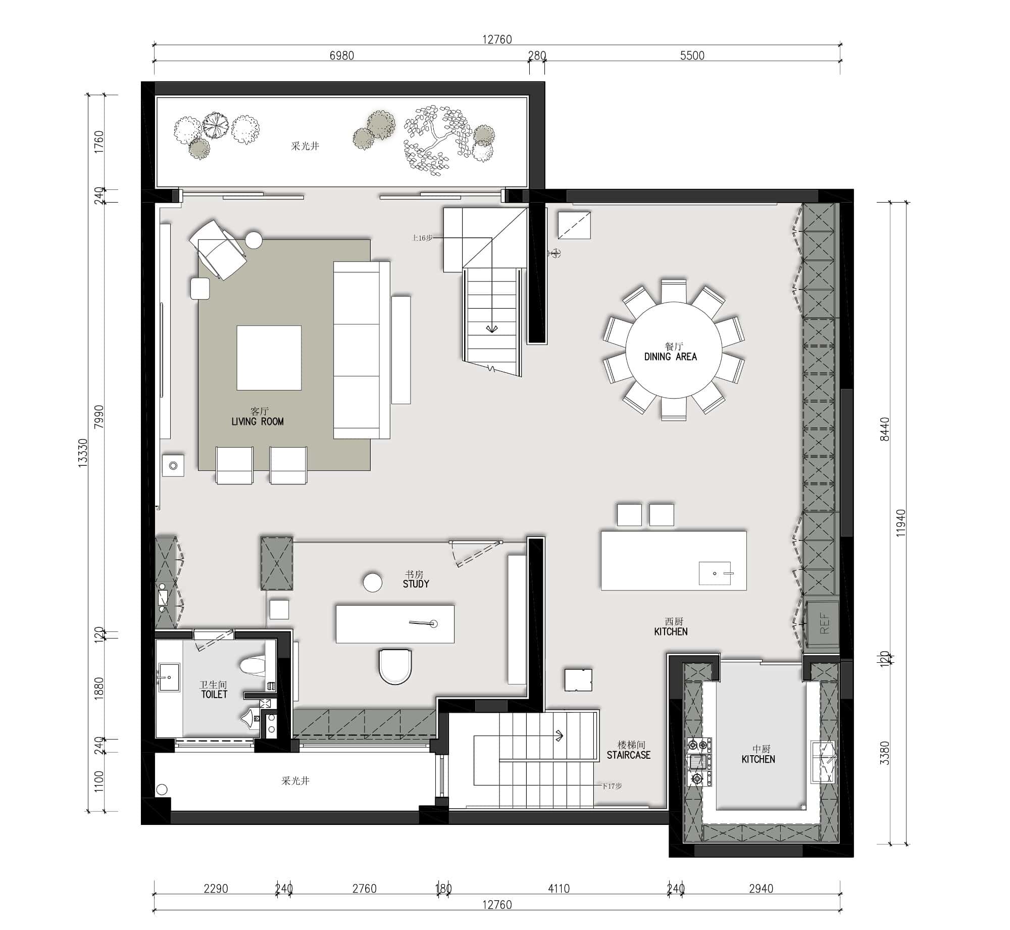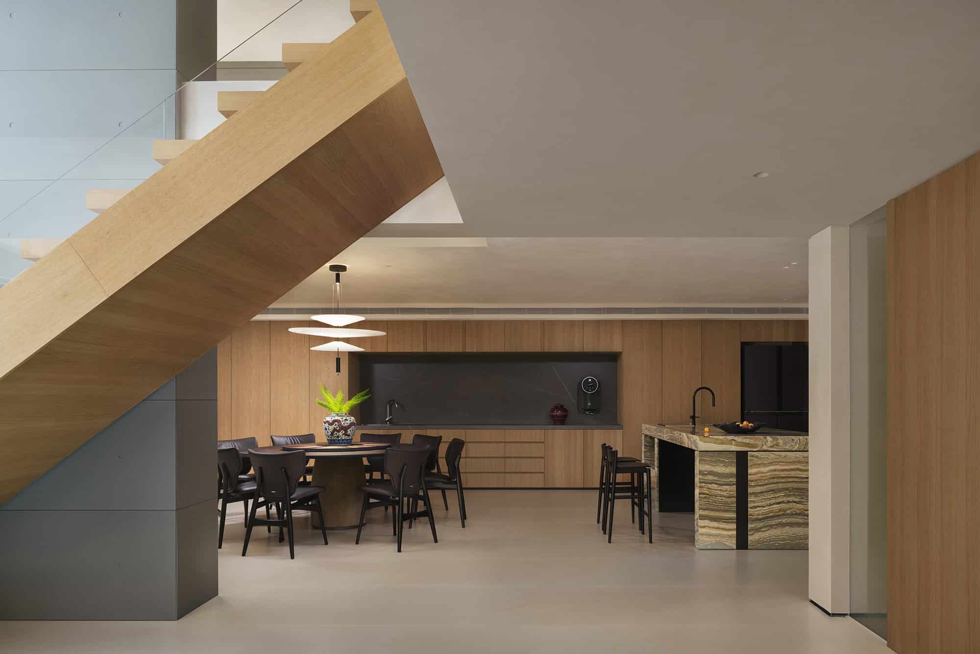 The mezzanine level was redesigned as the social and functional nucleus of the home — accommodating the living room, dining area, kitchen, and study. This reconfiguration strengthens the interaction between family members while fostering continuous dialogue between indoor and outdoor landscapes.