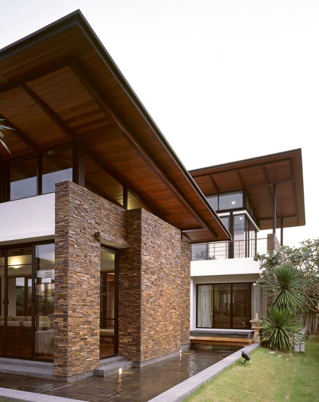 The public and private spaces are parallel to the X-axis and connect to the service space in the Y-axis. To maintain privacy, each pushed-in plane creates a working space area. The architects have skillfully combined genuine tropical style and energy conservation concepts to create this masterpiece. The lighting in all areas is balanced with positive and negative lights. The ceiling is designed to allow natural light to penetrate through during the day and diffuse light at night. Building materials such as wood, rock, and natural finishing products create the feeling of natural living with the essence of modern architecture.