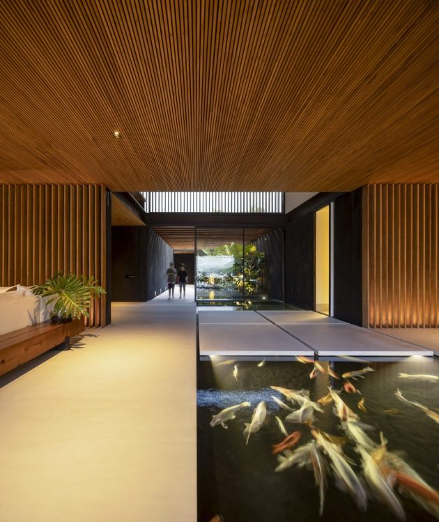 Entry into the house is mediated by a dramatic wooden pergola, which filters light and creates a transitional threshold from nature to interior. A large reflecting water feature flows through the interior, stitching rooms together and guiding the eye toward views.
