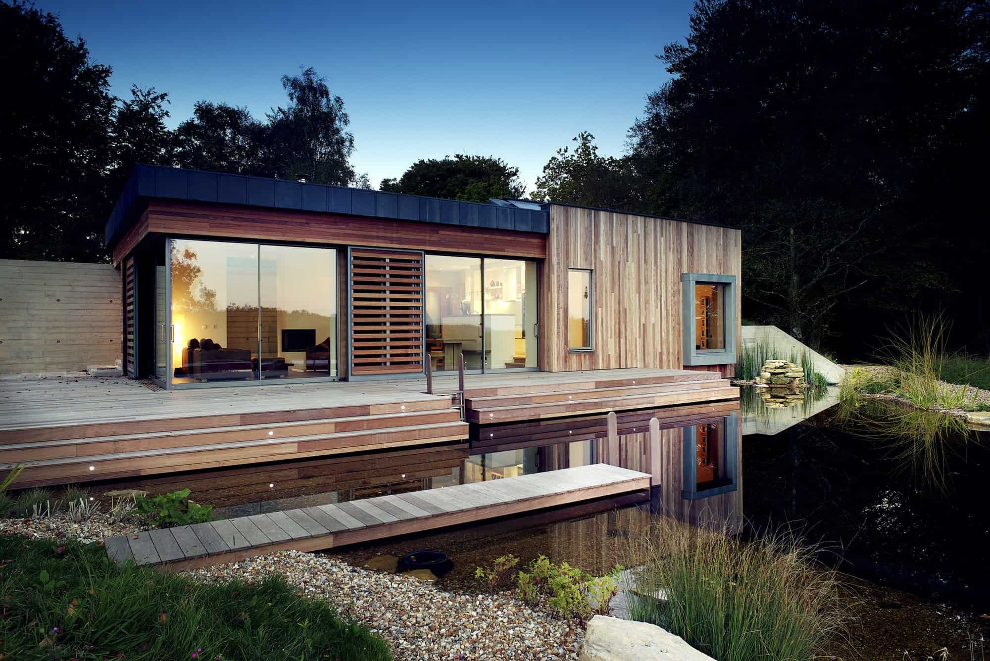 The buildings are orientated to maximise solar gain and utilise ground source heat pump technology and a log boiler for heating and hot water requirements. Excavated material from the new basement and pool area has been re-used in the earth-berming to provide a visual screen to the north and help to reduce the sound impact of the nearby dual carriageway. The proposals also incorporate rain water harvesting, grey water recycling and a natural swimming pond to further increase biodiversity within the site. The materials used throughout are sustainable, durable and in harmony with the site and its surroundings.