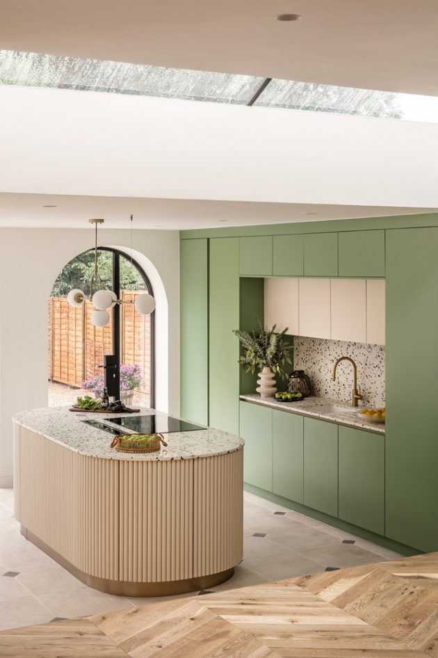 The up-and-over frameless glass box has been designed as a unique curved window seat. It cantilevers out and provides uninterrupted views out into the garden and up into the sky. It is a great place to sit throughout the year and also allows natural daylight to flood the dining table below. The bespoke kitchen units and island was designed by Studio Jayga Architects to echo the soft curves of the arched doors and curved glass box. The elliptical island is wrapped around with curved flutes and finished off with a colorful terrazzo worktop. Wall units are full height to maximize the amount of storage provided. Natural color tones have been used to compliment and bring the colors of the garden in.