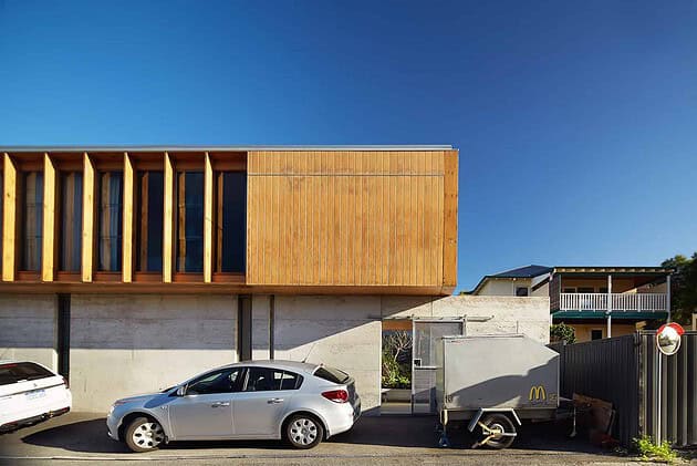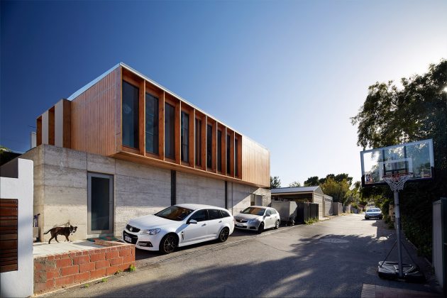 The form of the house is literally a timber box perched on top of stabilized recycled concrete walls. The heavy walls are embedded into the ground and define the internal and external living areas. The walls create a solid boundary with the right of way, concealing the openness and beauty of the spaces within.