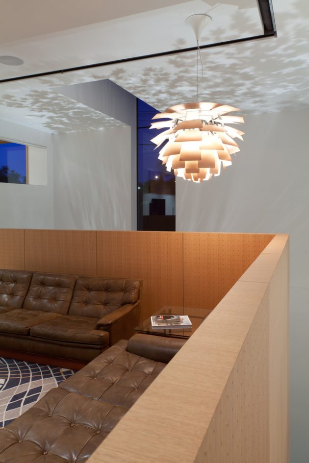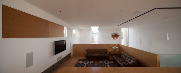 A large garage workshop and two bedrooms are also located on the lower level, connected to the kitchen meals and adjacent outdoor terrace via a ‘folded’ timber stair.