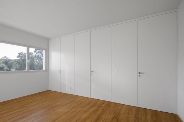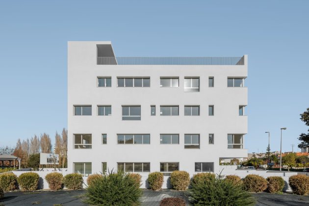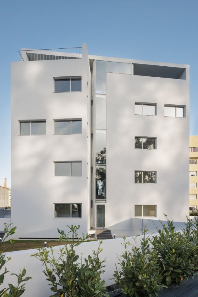This private initiative residential project is located next to the Circunvalação, on the northern edge of the city of Porto. The plot has a trapezoidal configuration and faces rua Nova do Rio. The building’s location in the center of the plot allowed openings to be created on all its facades.