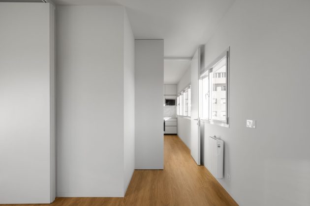 The access to the building converges to its center, this route is accentuated by the proximity and tension between the volumes. The program organizes two T0 apartments and fourteen T1 apartments, spread over four floors.