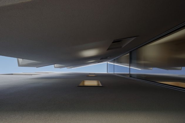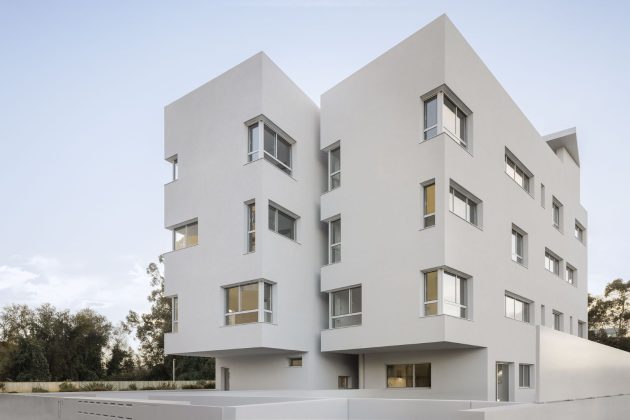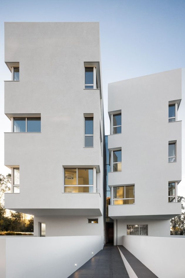 A basement floor was dedicated to parking. From the outside, the building’s facades are treated in a monochromatic light gray tone, which predominates in all its constructive elements. The windows obey to a random and dynamic matrix composition that at certain times breaks the corners of the volumes.