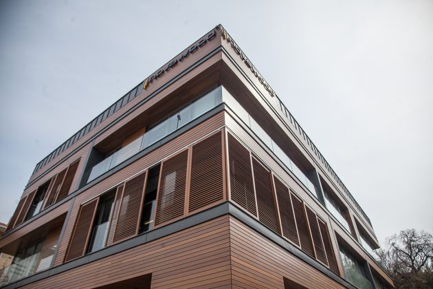 Modern commercial office building with contemporary architecture, glass facade, and wooden exterior accents. Ideal for architectural design inspiration and modern construction projects.