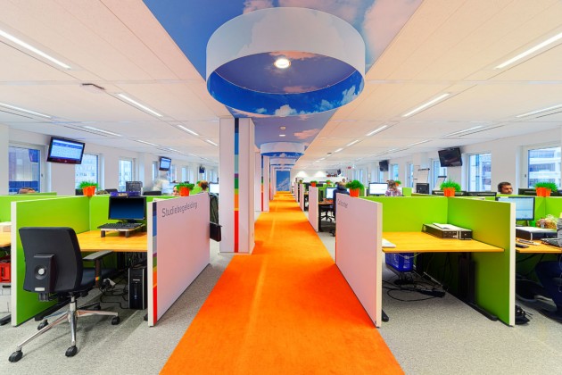 The call centre seems an enclosed space with matching acoustics when you are seated, but as you stand up you enter a wide open space where you can have contact with your colleagues.