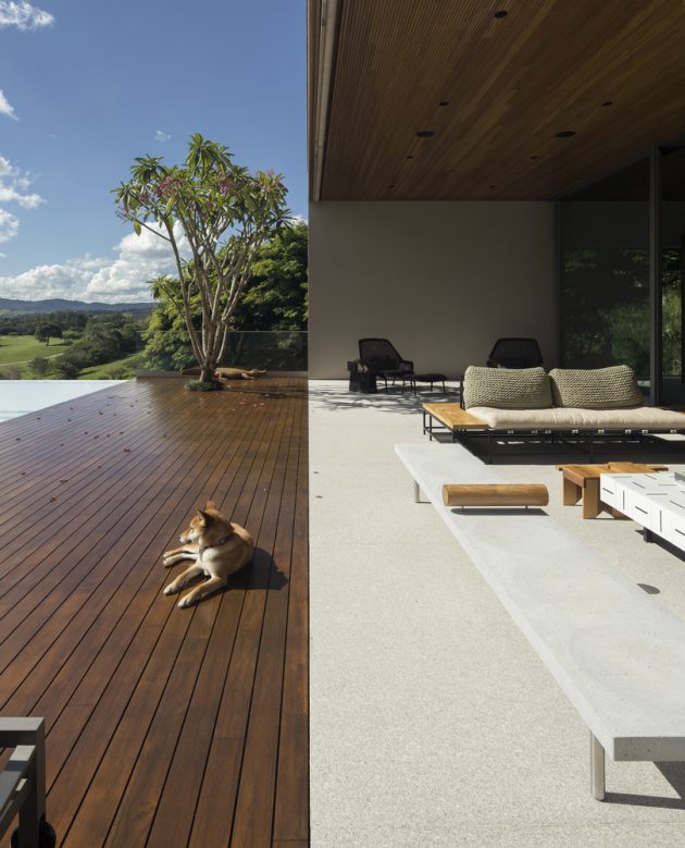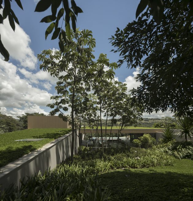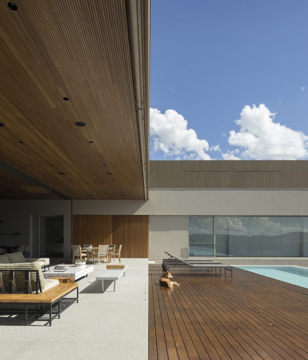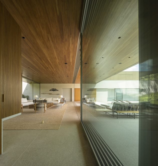 Finally, the upper volume, with a wood-appearance aluminum aspect, accommodates the master suite, the office space and three suites for the children. The balconies of this intimate area offer a view and access to the green roof. Thus, the house makes the most out of the golf course and the vegetation sight. The Interiors Design was made by Noura Van Dijk. The Landscape Project was designed by Luis Carlos Orsini, who was able to offer a harmonious continuity to the surrounding forest.