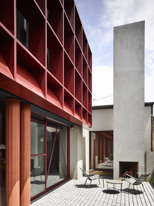 A project in the venerable tradition of alterations and additions to heritage houses – a testing ground for Architect’s ideas. This adaptive re-use of a double fronted Victorian house incorporates a re-working of the existing house, a new pavilion forming a central court yard, a garage and workshop building to the rear laneway and a small swimming pool. The house is distinctive for its mature Oak tree which towers above the garden and a red steel brise-soleil which performs many functions, including that of sun-shading.
