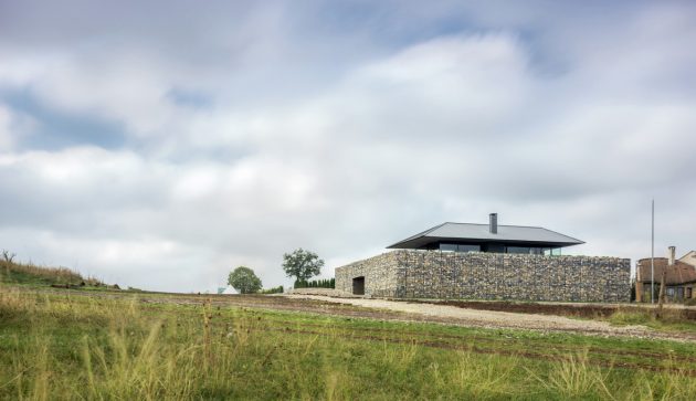 The site of the project is distinguished both by its panoramic views and distant visibility. In order to strengthen them, a part of the program is located in the seemingly blind bastion-like volume and the living area is elevated high on it. This brings view completion up to 360 degree and privacy in the fully opened space above.The pitched roof connects geometrically the upper volume with the base and adds complexity in the interior space while the oversized eaves connect it to the little meadow around and exaggerate the hovering effect of the slim metal structure. The proportion and the materiality of the solid base give it the appearance of an infrastructural object that define the edge of the village and conceal the ambitious program of the house.