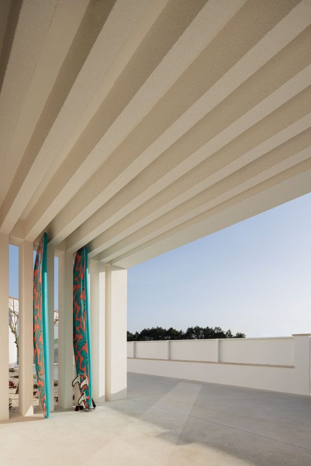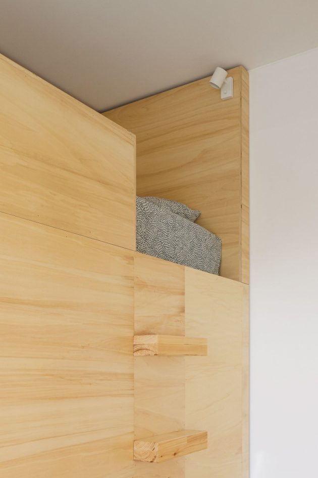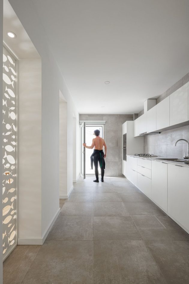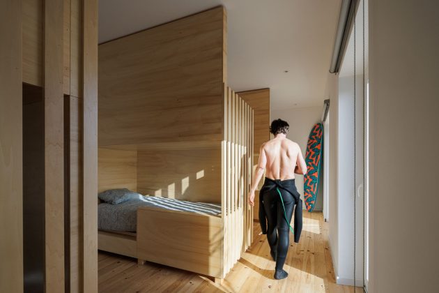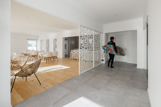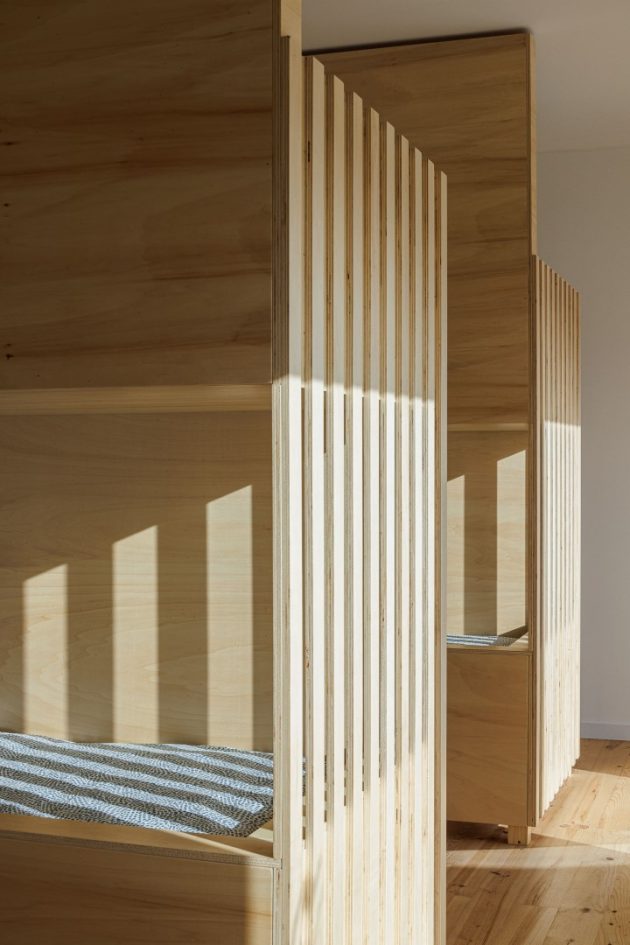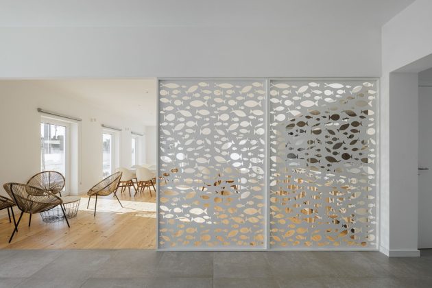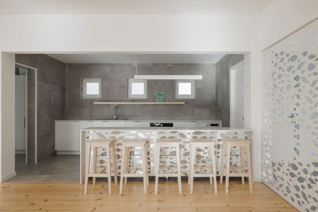 In order for the interior to be reminiscent of the sea, aluminum panels were created with drawings of marine motifs cut in “CNC”, namely in the division between the hall and the living room and the bar counter. The design of the bunk beds was also a big challenge since it was about incorporating 8 beds, in 33m2, they were carefully designed in wood and developed in a way that they obtained privacy, esthetics and functionality.