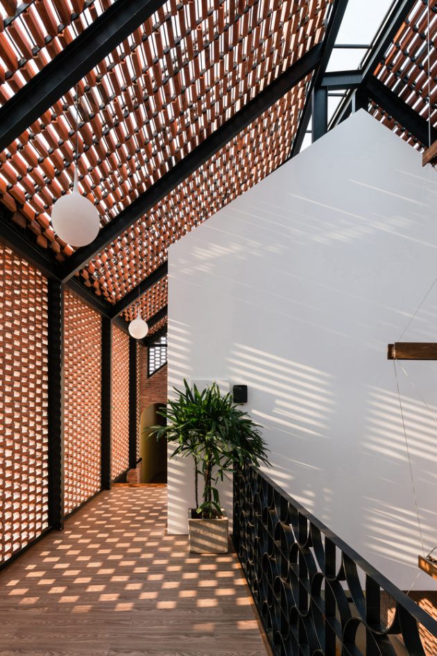 Bricks form an outermost cover to protect the whole house. Also, they can filter the inner microclimate. Buffers such as lobbies, porches and voids are reasonably arranged to circulate fresh air. The floor plan draws its inspiration from traditional three-part country houses, which include three main areas in the heart and two bedrooms on either side. These areas lie parallel to the adjacent empty land in order to harness natural wind and light.
