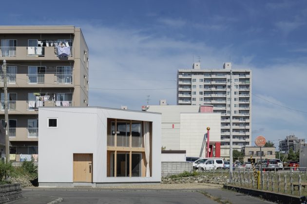 Modern minimalist tiny house with white exterior and large windows, situated in an urban area with high-rise apartment buildings in the background.