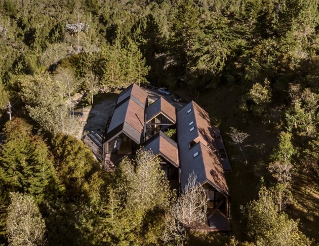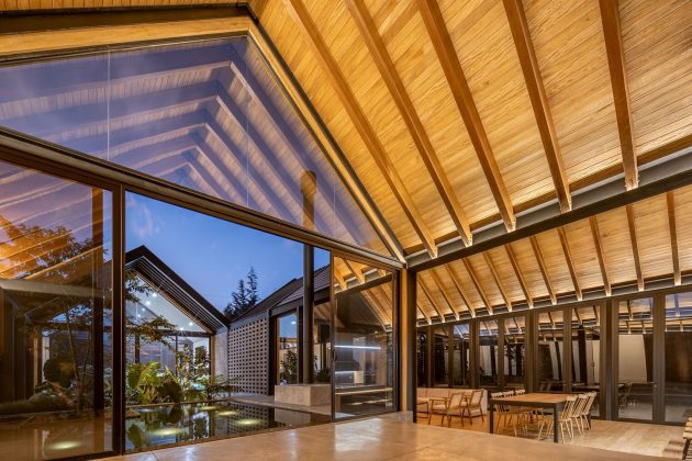 Access to the house is via a central pavilion that doubles as an intermediary space: a foyer, interior courtyard, and study conceived as interconnected volumes without solid walls, framed instead by glass that maintains visual continuity with the forest beyond. This central void becomes both a physical and experiential threshold between interior and exterior, inviting light and landscape deep into the home.