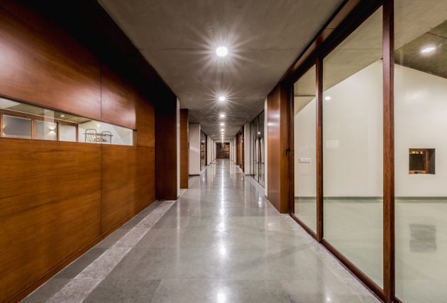 The exposed RCC ceiling is patterned with the bamboo curtains, with a complete green cover at the terrace. The building preserves water with its reverse boring to help recharge the ground water table.