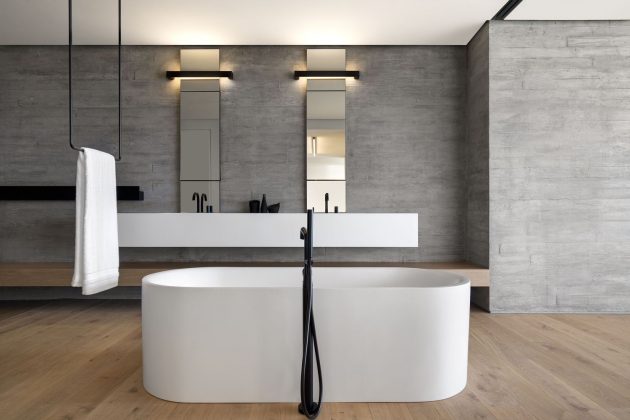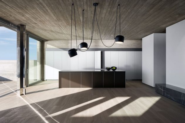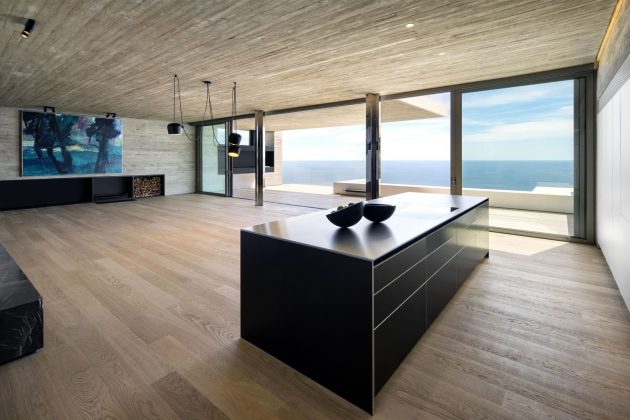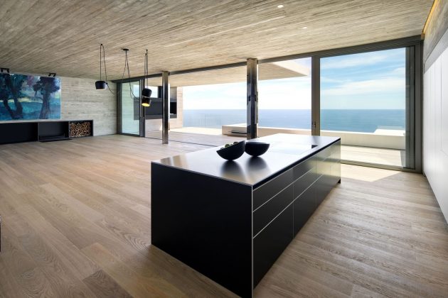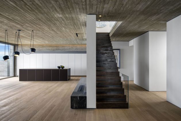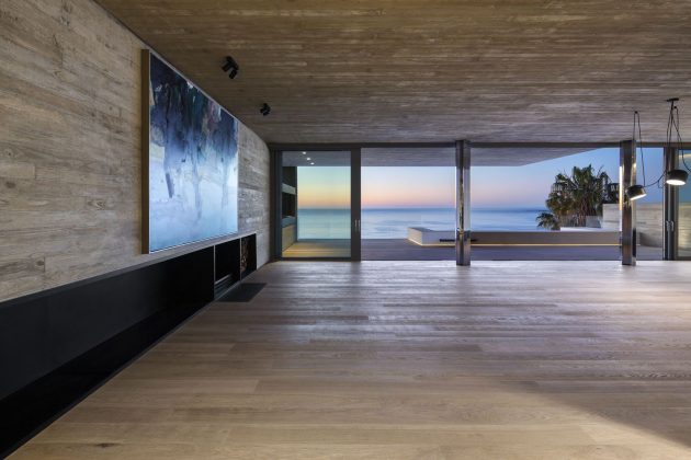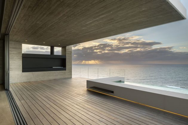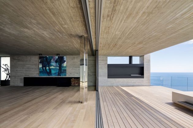 The master suite dramatically cantilevers over the external entertainment and pool area in order to capitalize on the views. It creates the planked concrete soffit of the main living level as it stretches out towards the horizon.