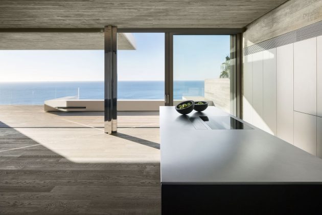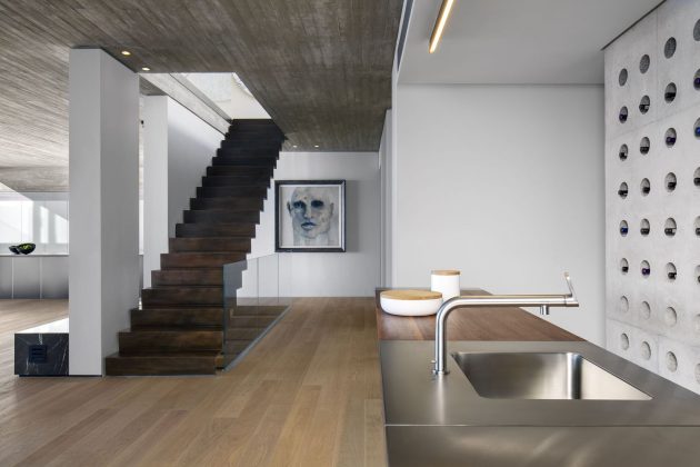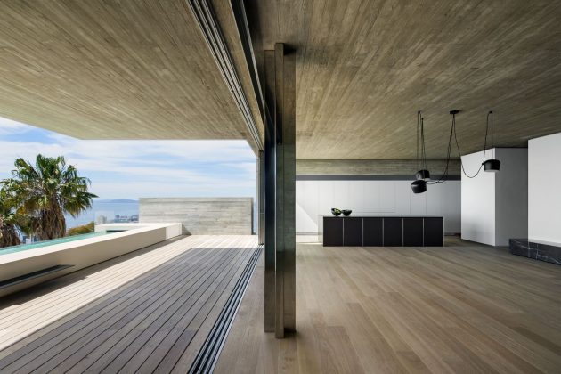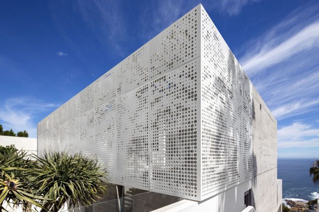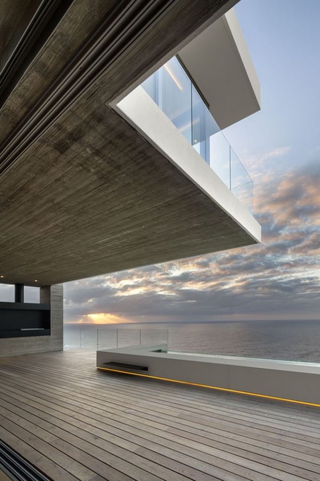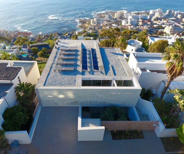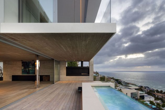 From the architects: “OVD525 is a private home located in Bantry Bay, Cape Town. The steep mountainside site boasts un-disturbed views over Cape Town’s Atlantic Seaboard and Robben Island to the north and north-east. The city is seen in the distance towards the east and the iconic Lion’s Head Mountain towers over the house from the south. Western views take advantage of spectacular ocean-sunsets.